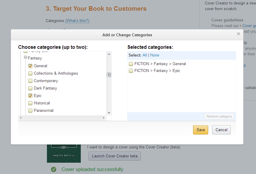 You can select two BISAC categories, and they’re all relatively vague. BISAC codes are assigned to help publishers and libraries make sense of book subjects for the purposes of developing metadata. Amazon uses BISAC codes only to some extent. However, they also have their own internal ranking and categorization system that determines the all-important Top 100 lists.