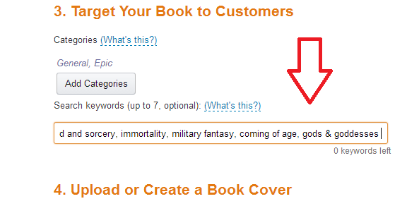 Now, here’s what you do. When you’re publishing your Kindle book, and you’ve filled out your BISAC options, you’ll see an unassuming little box for seven keywords right underneath: